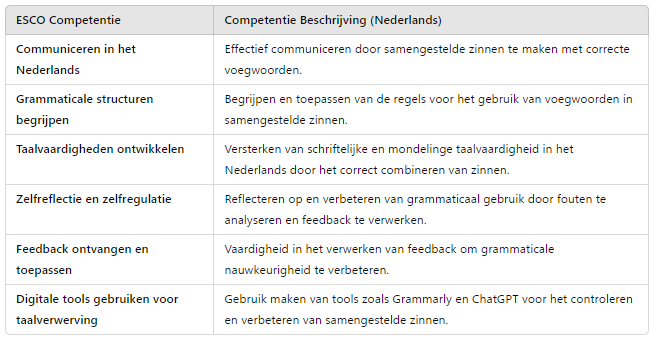 In deze opdracht leer je hoe je voegwoorden correct gebruikt in samengestelde zinnen door te oefenen met schrijven, reflecteren en verbeteren. Je past verschillende voegwoorden toe in zinnen en controleert je werk met behulp van feedbacktools zoals Grammarly en ChatGPT.