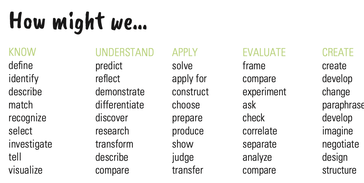 5. Each question should adhere to the logic of “How might we...” followed by a verb (e.g. develop), a noun (e.g. a set of tools), and the type of ‘user’ (e.g. young people in rural areas).